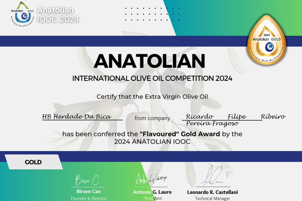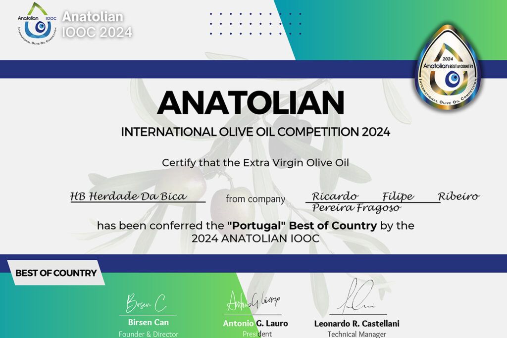 No prestigiado Concurso “Anatolian International Olive Oil Competition (IOOC)” deste ano, o azeite virgem extra Herdade da Bica, foi premiado com duas distinções, “Medalha de Ouro” e “Best of Country” na categoria Monovarietal – Cobrançosa, sendo assim recompensada a qualidade do azeite virgem extra que produzimos.